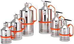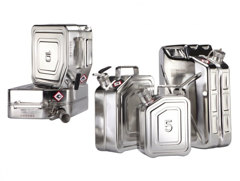 Safety containers made of high quality stainless steel (wall thickness 0.6 mm) with PTFE gaskets – for long life. Safe filling and dosing of flammable liquids